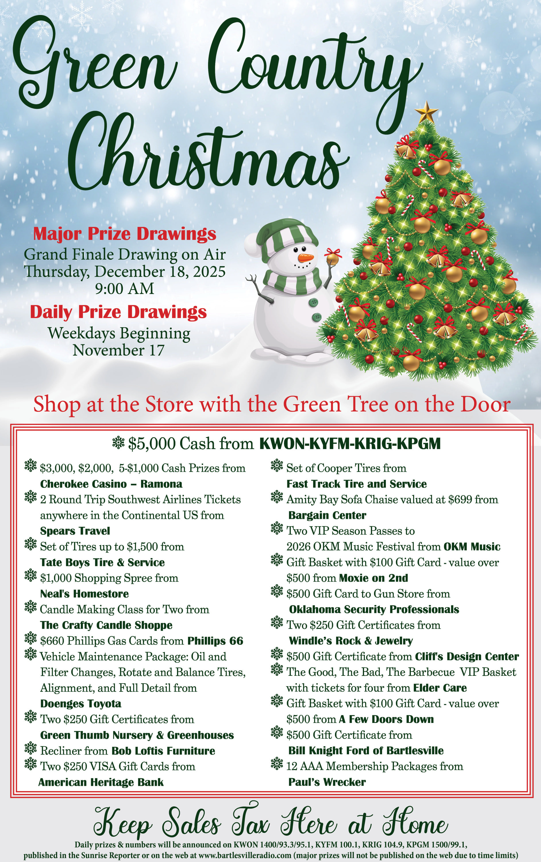 For daily drawings starting November 17th and participating merchants go to Bartlesville Radio » Green Country Christmas Giveaway